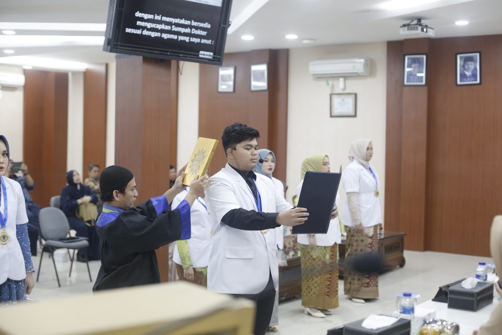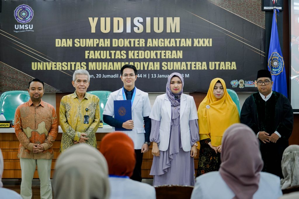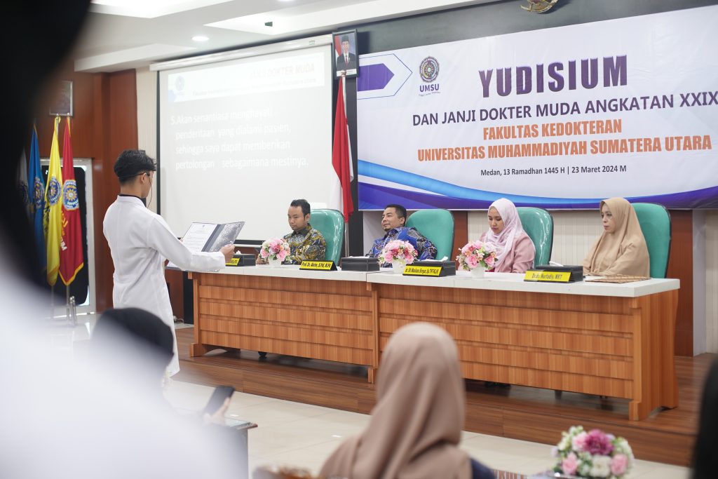 25 oktober 2023, di Aula Fakultas Kedokteran UMSU Fakultas Kedokteran Universitas Muhammadiyah Sumatera Utara (FK UMSU), menggelar prosesi Yudisium dan Sumpah Dokter yang diikuti 9 dokter angkatan 35, pada Rabu (25/10/2023) di Aula FK UMSU Jalan Gedung Arca, Medan.