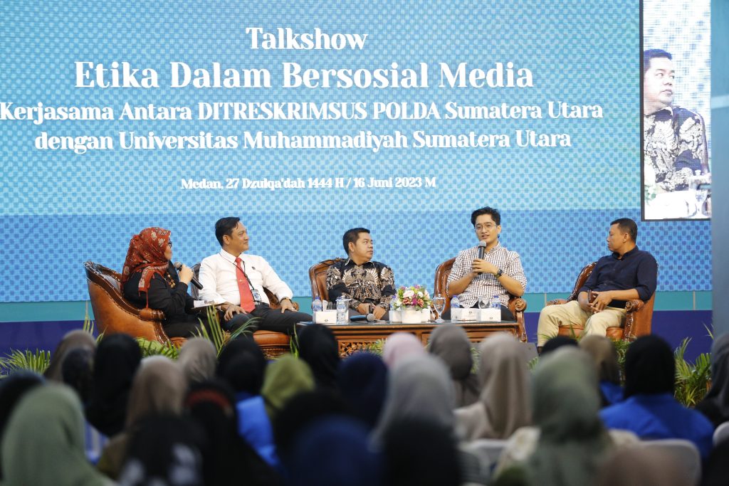 16 Juni 2023, di Kampus Utama UMSU Direktorat Reserse Kriminal Khusus Kepolisian Daerah Sumatera Utara, bersama Universitas Muhammadiyah Sumatera Utara (UMSU) menggelar talkshow bertajuk, “Etika dalam Bermediasosial di auditorium Kampus Utama UMSU, Medan, Jumat (16/6/2023).